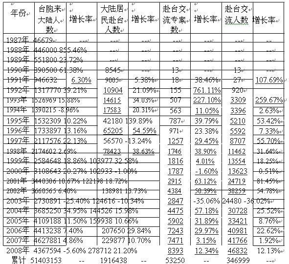 表1:大陸臺灣歷年往來人數(shù)統(tǒng)計表