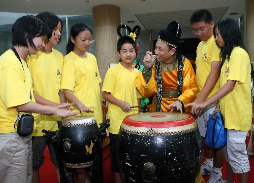 7月8日,參加中國(guó)尋根西安之旅夏令營(yíng)的華裔青少年在西安博物院與樂(lè)師一起打鼓。