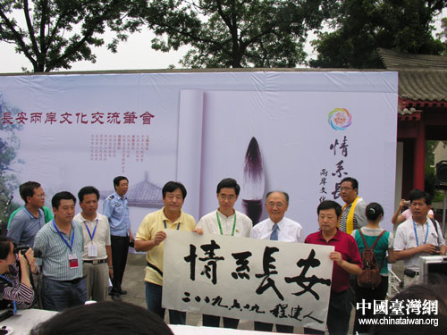 最后在主辦方再三邀請下,“情系長安——兩岸文化聯(lián)誼行”臺灣嘉賓團團長程建人先生登場,寫下了“情系長安”四個大字。自謙“不會寫字”的程建人的字卻得到現(xiàn)場熱烈的掌聲。