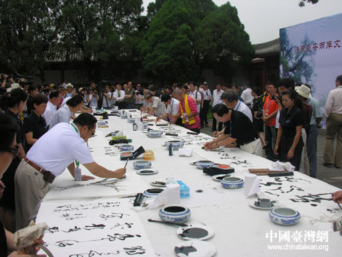 中國臺灣網(wǎng)7月20日陜西黃陵縣消息 7月19日,參加“情系長安——兩岸文化聯(lián)誼行”活動的96位臺灣文化界人士,在黃帝陵恭祭軒轅黃帝,并在祭陵結(jié)束后來到軒轅廟古柏院。兩岸的書法家代表在千年古柏樹下,進行了一場別開生面的文化交流筆會。