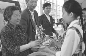 1991年6月1日,全國勞動模范、著名小學(xué)教師斯霞在為江蘇南京師范大學(xué)附屬小學(xué)優(yōu)秀學(xué)生發(fā)獎。斯霞1956年加入中國共產(chǎn)黨。1922年就讀于杭州女子師范學(xué)校。1927年畢業(yè)后,先后在浙江紹興、嘉興、蕭山、杭州及江蘇南京等地小學(xué)任教。上世紀五十年代,她創(chuàng)造出“字不離詞、詞不離句,句不離文”的小學(xué)語文隨課文分散識字教學(xué)法,大面積、高效率地提高了識字教學(xué)的質(zhì)量。她教的學(xué)生在兩年內(nèi)就認識了2000多個漢字,讀了174篇課文,在當(dāng)時國內(nèi)小學(xué)教育界首屈一指。六十年代,經(jīng)專家學(xué)者總結(jié)、論證,斯霞的“以語文教學(xué)為中心,把識字、閱讀、寫話三者結(jié)合起來”的小學(xué)語文教學(xué)法,在全國產(chǎn)生廣泛影響。2004年1月12日,斯霞在南京逝世,享年94歲。 |