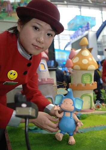 4月8日,在西安曲江會(huì)展中心,陜西洋縣的參展人員用卡通造型展示生活在其境內(nèi)的大熊貓、金絲猴、羚牛、朱鹮等珍稀野生動(dòng)物。