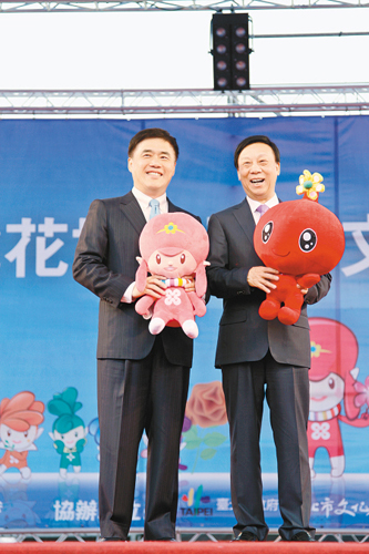 陜西省委常委、西安市委書記孫清云與臺北市市長郝龍斌為落戶臺北花博會園區(qū)的“長安花”揭幕