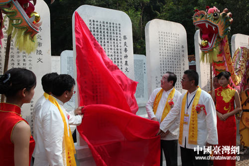 臺(tái)灣“中華神農(nóng)大帝協(xié)進(jìn)會(huì)”理事長(zhǎng)陳福財(cái)、名譽(yù)理事長(zhǎng)李乾龍,全國(guó)臺(tái)企聯(lián)會(huì)長(zhǎng)郭山輝、常務(wù)副會(huì)長(zhǎng)葉宏燈為祭炎帝神農(nóng)文石碑揭碑(中國(guó)臺(tái)灣網(wǎng) 趙輝 攝)
