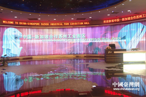 蘇州工業(yè)園區(qū)展區(qū)大廳,左為新加坡標志標志性建筑—“魚尾獅”,右為園區(qū)標志性建筑——“圓融”(中國臺灣網(wǎng) 李典典 攝)