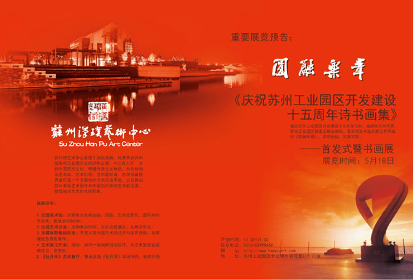 值此蘇州工業(yè)園區(qū)開(kāi)發(fā)建設(shè)十五年之際,由政協(xié)蘇州市委、蘇州工業(yè)園區(qū)管委會(huì)聯(lián)合編輯、薈萃詩(shī)文書(shū)畫(huà)名家之作而成的“慶祝工業(yè)園區(qū)開(kāi)發(fā)建設(shè)十五周年詩(shī)書(shū)畫(huà)集”——《圓融樂(lè)章》首發(fā)式暨書(shū)畫(huà)展將于5月18日在李公堤漢璞藝術(shù)中心舉辦。