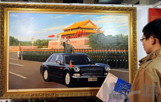 11月18日,一名觀眾在欣賞油畫《盛世中國》。當(dāng)日,“盛世中國”系列油畫在第五屆中國北京國際文化創(chuàng)意產(chǎn)業(yè)博覽會上展出。據(jù)介紹,“盛世中國”系列主題油畫包括《2008·一月雪》、《共瓷》、《和諧頌經(jīng)》、《盛世中國》四幅,是兩位畫家歷時近兩年時間創(chuàng)作完成。