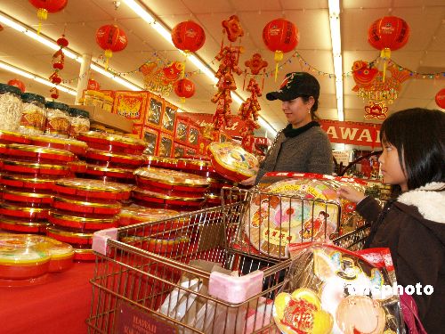 圖為華人顧客正在夏威夷超市挑選年貨,迎接2009年春節(jié)。 中新社發(fā) 盧威 攝