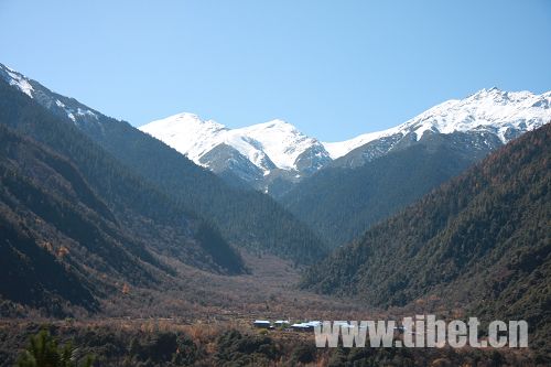 前往巴松措途中的小景,雪山下綠樹成蔭,深山藏人家。攝影施遠道
