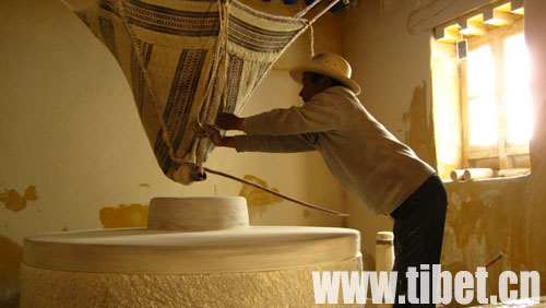 小小不足10平方米的磨房內(nèi),靜靜擺放著一個(gè)巨大的石磨,石磨分直徑約1.2米的上薄下厚兩塊,磨盤上方正中吊有盛青稞的底部開口的布袋,布袋上綁著一根細(xì)木料與磨盤接觸,“刷刷――刷刷――”上面的薄石盤開始轉(zhuǎn)動(dòng),青稞就從布袋開口處“嗒嗒嗒~”地落入磨中。