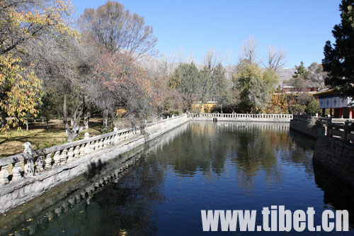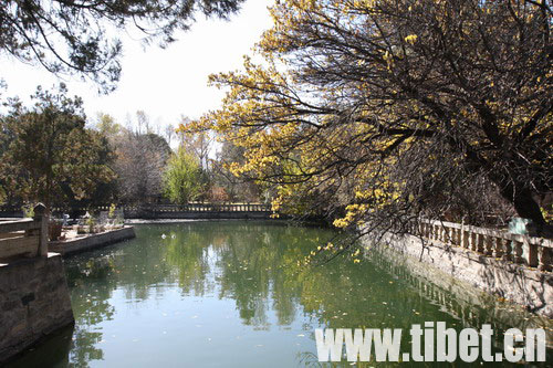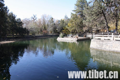 八世達(dá)賴在此基礎(chǔ)上把舊有的水塘開挖成湖,按漢式亭臺(tái)樓閣的建筑風(fēng)格,在湖心建了龍王廟和湖心宮,兩側(cè)架設(shè)了石橋。