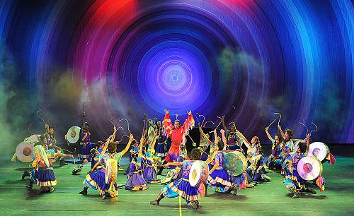 8月31日,演員在大型西藏原生態(tài)歌舞詩(shī)《幸福在路上》中表演“祈日鼓”。