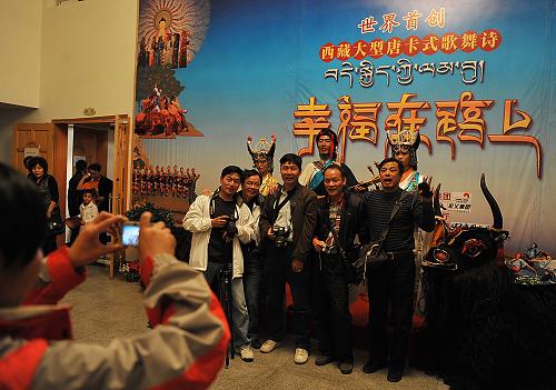 8月31日,觀眾在大型西藏原生態(tài)歌舞詩(shī)《幸福在路上》演出結(jié)束后與演員合影留念。新華社記者 魯鵬 攝