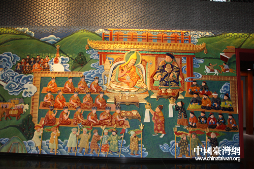 進(jìn)門之后,映入眼簾的是一幅大型浮雕壁畫,描述了五世達(dá)賴?yán)锔熬┯P見(jiàn)順治皇帝的場(chǎng)景。(中國(guó)臺(tái)灣網(wǎng) 李典典攝)