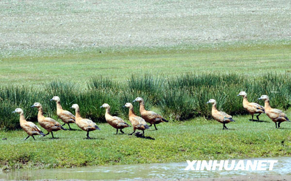 8月7日,國(guó)家二級(jí)保護(hù)動(dòng)物黃鴨在藏北草原河邊“漫步”。 新華社記者 唐召明 攝