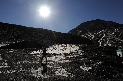 1月14日,一位外國游客在西藏卡若拉冰川前行走。 新華社記者 金良快 攝