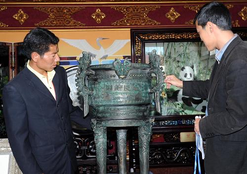 當日,全國政協(xié)在拉薩向西藏自治區(qū)政協(xié)贈送一尊象征團結(jié)民主、和諧的紀念鼎——“團結(jié)民主紀念鼎” 。新華社記者覺果攝