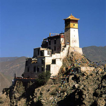 雍布拉康位于山南乃東縣境內(nèi)、距澤當(dāng)鎮(zhèn)約12公里處的雅礱河?xùn)|岸覺姆扎西次日山的山頭上,上窄下寬,三面臨崖。始建于公元前2世紀(jì)初,最初并非寺廟,后經(jīng)第三十二代贊普松贊干布在原來宮殿的兩側(cè)修建了兩層樓的殿堂,雍布拉康遂改作經(jīng)堂,歷代都進(jìn)行了擴(kuò)建,逐漸在殿堂的兩邊增建了門廳,南邊增建了僧房。五世達(dá)賴時(shí)期又在碉樓式建筑上加修了四角攢尖式金頂。寺的規(guī)模不大,但由于建寺歷史悠久,加之雄踞山頭,氣勢(shì)雄偉壯觀,相傳文成公主夏天常來雍布拉康小住,吐蕃歷代贊普亦常到雍布拉康小憩,因此,該建筑聲名遐邇。自治區(qū)人民政府于1962年確定雍布拉康為自治區(qū)文物古跡保護(hù)單位,凡到山南旅游觀光者無(wú)不到此一游。