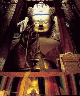 佛像全身共用紫銅皮二十三萬(wàn)余斤,黃金八千多兩,眉間白毫用的大金鋼鉆石三十個(gè),大珍珠三百余顆及各種珊瑚、琥珀、松耳石等一千四百多。由一百一十名工匠,花了二年多的時(shí)間才將佛像建成,成為世界上最大的鍍金銅佛。佛教認(rèn)為,五億七千年之后強(qiáng)巴佛將接替釋迦牟尼而成為佛教至尊,故稱(chēng)之為未來(lái)佛。