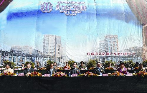 2009年4月25日上午,西藏最大的房地產(chǎn)項目——海亮世紀新城,開工儀式在拉薩柳梧新區(qū)舉行。張慶黎、公保扎西、孟德利出席開工儀式并為工程奠基。(圖片來源:《西藏日報》旦增 攝)