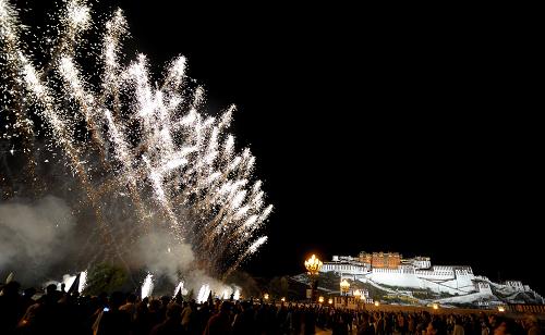 資料圖片:8月20日,2009中國拉薩雪頓節(jié)開幕,當晚布達拉宮廣場上舉行音樂焰火晚會。新華社記者 普布扎西 攝