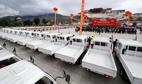 6月29日,為西藏行政村配備的農(nóng)用運輸車停放在布達(dá)拉宮廣場。當(dāng)日,黨中央、國務(wù)院為“西藏百萬農(nóng)奴解放紀(jì)念日”向西藏農(nóng)牧民群眾贈送物資儀式在拉薩舉行。黨中央、國務(wù)院在西藏慶!拔鞑匕偃f農(nóng)奴解放紀(jì)念日”之際,下?lián)?.3億多元專項經(jīng)費,專門用于為西藏行政村配備農(nóng)用運輸車,實施西藏?zé)o電地區(qū)應(yīng)急照明工程,給有電地區(qū)群眾配備廣播電視接收器,給“三老”人員發(fā)放慰問金和頒發(fā)紀(jì)念證書,對生活困難群眾發(fā)放補貼經(jīng)費。新華社記者覺果攝
