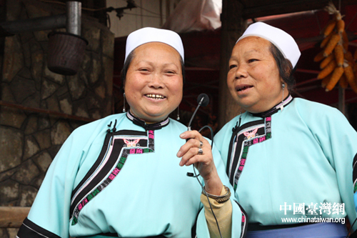 兩位大娘娘為到訪的記者們獻(xiàn)上山歌(中國臺(tái)灣網(wǎng) 楊永青 攝)