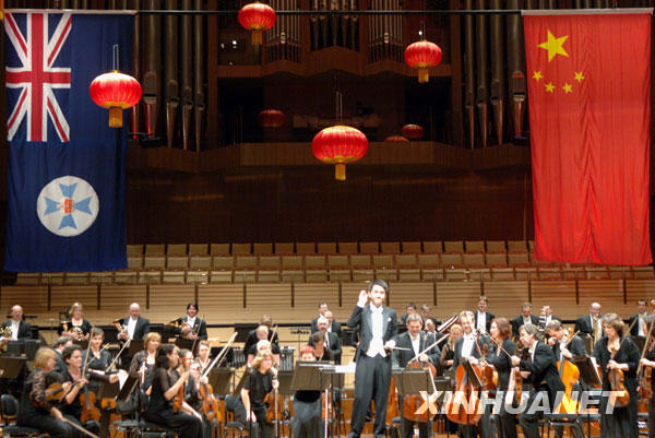 9月2日,在澳大利亞東部海濱城市布里斯班的昆士蘭州表演藝術(shù)中心音樂大廳,來自中國香港愛樂樂團(tuán)的副指揮蘇柏軒與昆士蘭交響樂團(tuán)演出后向觀眾致謝。當(dāng)日,為慶祝中華人民共和國成立60周年和中國傳統(tǒng)佳節(jié)中秋節(jié),以及昆士蘭建州150周年,由昆士蘭交響樂團(tuán)和來自中國的年輕藝術(shù)家們?cè)谶@里聯(lián)袂演出一場題為“東西合璧”的音樂會(huì)。 新華社記者江亞平攝