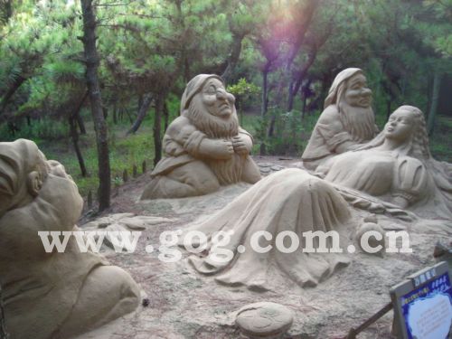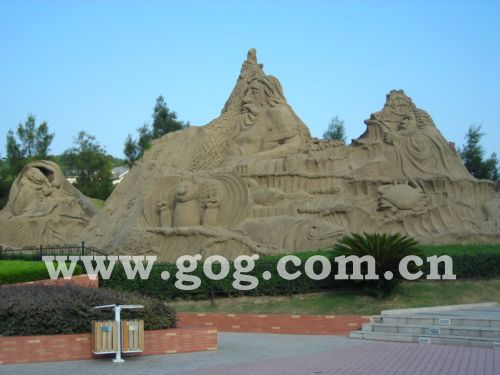 當(dāng)天下午,“輝煌60年 全國網(wǎng)媒記者浙江行”采訪團(tuán)來到位于舟山朱家尖海灘公園,參觀了該海灘公園。當(dāng)記者們來到公園門前時(shí),就被一副巨大的雕塑作品吸引了,走進(jìn)一看才發(fā)現(xiàn),原來這尊雕塑全部都是用沙子雕砌而成的。走進(jìn)公園后發(fā)現(xiàn),公園內(nèi)通往海濱公園的道路兩旁,都是用海砂雕塑的作品:有小孩子喜歡的白雪公主和小矮人,有神秘莫測(cè)的埃及金字塔,還有英姿颯爽的運(yùn)動(dòng)健兒......總之,只要想得到的,這里都應(yīng)有盡有,這便是被喻為將沙子變成金的沙雕藝術(shù)。
