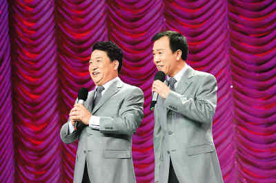 圖為姜昆(左)和戴志誠在表演新作《我有點(diǎn)暈》。