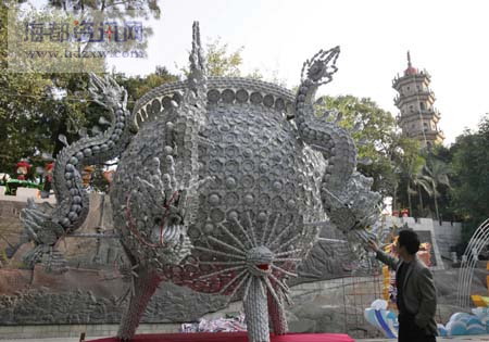 焰火首次在閩江中心順流燃放,相當(dāng)一部分曾在北京奧運(yùn)會(huì)開(kāi)幕式上亮 相的萬(wàn)朵禮花將點(diǎn)亮閩江夜空;66688個(gè)玻璃瓶扎成的“麒麟獻(xiàn)瑞”玻璃瓶燈組惟妙惟肖;近3萬(wàn)件景德鎮(zhèn)瓷器捆扎而成的“盛世太平鼎”陶瓷燈,氣勢(shì)磅礴……第七屆“兩馬同春鬧元宵”將于正月十四晚,在福州馬尾江濱東大道馬江渡廣場(chǎng)舉行開(kāi)幕式,當(dāng)晚2.5萬(wàn)發(fā)焰火將持續(xù)燃放40分鐘。昨日,記者提前往馬尾探訪今年大型燈會(huì)的亮點(diǎn)。