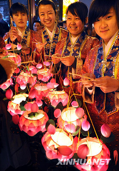 2月7日,身著古裝的工作人員準(zhǔn)備給游人贈(zèng)送荷花燈。新華社記者孫參攝