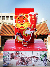 金門元宵燈會的主題燈“;⑸S燈”,下午由金門縣文化局人員布置完成,高4.5公尺的虎燈,擺設在浯江書院的中庭,十分搶眼。