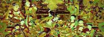 另外還有民族傳統(tǒng)神話題材及各種各樣的裝飾圖案。從壁畫中,可以看到各民族各階層的各種社會(huì)活動(dòng),如帝王出行、農(nóng)耕漁獵、冶鐵釀酒、婚喪嫁娶、商旅往來、使者交會(huì)、彈琴奏樂、歌舞百戲……世間萬象,林林總總。